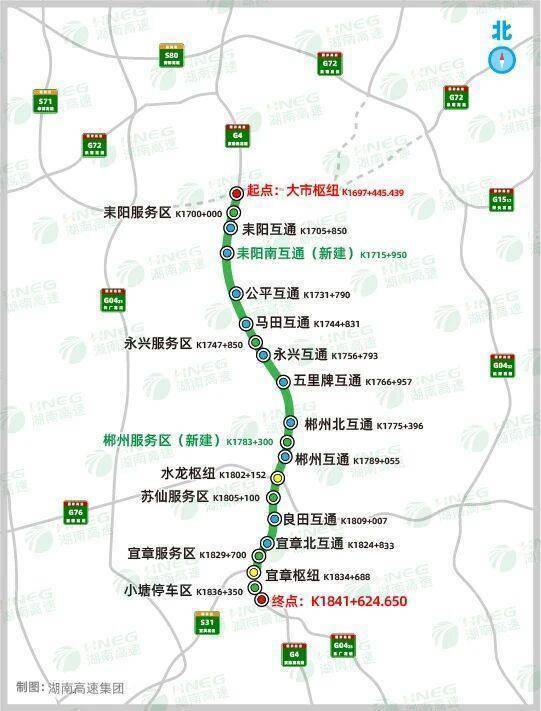 G4京港澳高速耒阳大市至宜章(湘粤界)段改扩建工程起于耒阳大市枢纽,往南经耒阳、永兴、苏仙、北湖和宜章等5个县市区,止于宜章小塘(湘粤省界),与G4京港澳高速粤北段相接。路线全长144.309公里,采用双向八车道高速公路标准对老路进行改扩建。其中,起点大市枢纽至五里牌互通段设计速度120公里/小时,路基宽度41.5米;五里牌互通至终点段设计速度100公里/小时,路基宽度41米。全线设互通立交12处、收费站11座、服务区5处、停车区1处,其中新增郴州服务区、耒阳南互通。